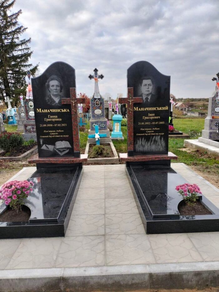 Пам’ятник подружжю з дзеркальними стелами. Виконаний із каменю габро та капустянського граніту.